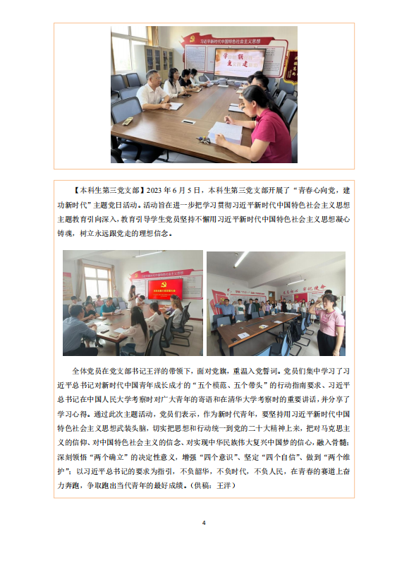 【本科生第三党支部】2023年6月5日,本科生第三党支部开展了“青春心向党,建功新时代”主题党日活动。活动旨在进一步把学习贯彻习近平新时代中国特色社会主义思想主题教育引向深入,教育引导员工党员坚持不懈用习近平新时代中国特色社会主义思想凝心铸魂,树立永远跟党走的理想信念。