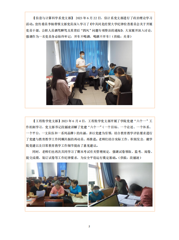 【行政党支部】2023年6月21日,行政党支部开展集中专题学习活动,学习和讨论了校纪检委《关于开展党员干部、公职人员酒驾醉驾及其背后“四风”问题专项整治的通知》、党委学习通课程2.7.6“党纪有话说”专题的相关内容。活动由党支部书记张梅主持。