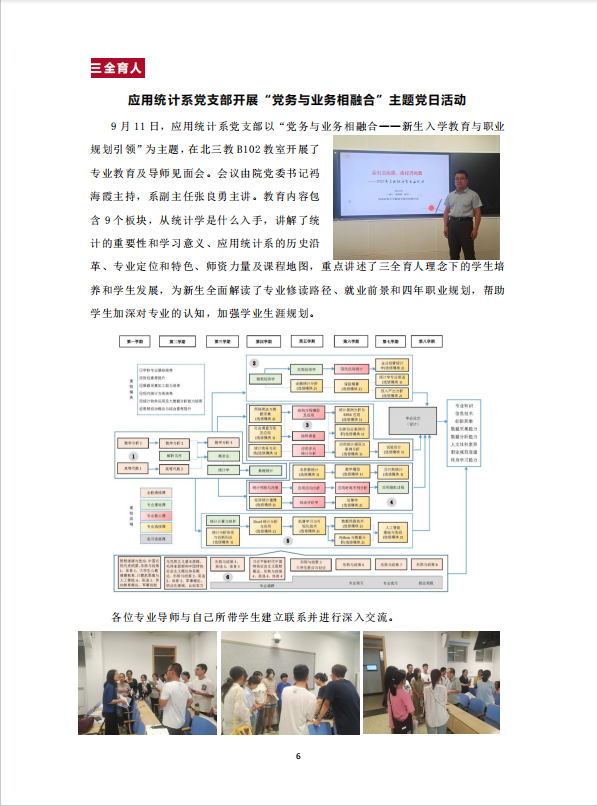 9月11日,应用统计系党支部以“党务与业务相融合——新生入学教育与职业规划引领”为主题,在北三教B102教室开展了专业教育及导师见面会。会议由公司党委书记祃海霞主持,系副主任张良勇主讲。教育内容包含9个板块,从统计学是什么入手,讲解了统计的重要性和学习意义、应用统计系的历史沿革、专业定位和特色、团队力量及课程地图,重点讲述了三全育人理念下的员工培养和员工发展,为新生全面解读了专业修读路径、就业前景和四年职业规划,帮助员工加深对专业的认知,加强学业生涯规划。