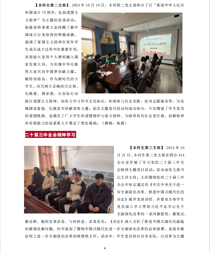 【本科生第一党支部】2024年10月9日,本科生第一党支部组织开展党日活动,学习《求是》2024年第19期文章:大力弘扬伟大爱国主义精神,把强国建设、民族复兴伟业不断推向前进(习近平)。活动正值国庆节刚刚结束,全体同学仍沉浸在节日的欢庆气氛中,开展爱国主义精神学习,有助于持续推进爱国情感的深入。党员们通过深入学习和深刻领悟,纷纷表示将不断增强个人综合素质,以良好的精神面貌投入强国建设中。(撰稿:高会颖)