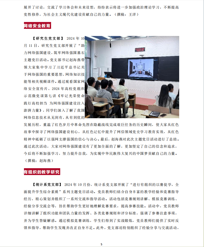 【行政党支部】2024年10月,行政党支部按照公司党委和公司党委的安排及要求,学习了习近平《论教育》等内容;10月11日集中观看了2024年高公司党组织示范微党课(第二阶段)第七讲《牢记光荣使命 践行高校担当 为网络强国建设注入澎湃力量》,学习和实践活动取得了较好效果。(撰稿:张梅)