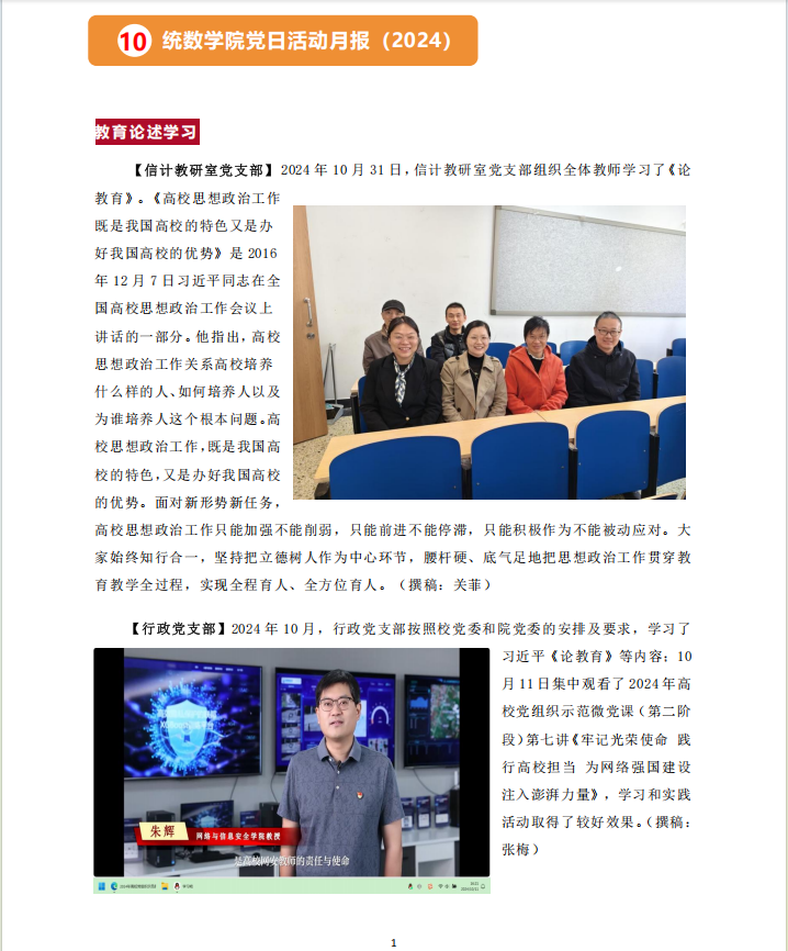 【信计教研室党支部】2024年10月31日,信计教研室党支部组织全体教师学习了《论教育》。《高校思想政治工作既是我国高校的特色又是办好我国高校的优势》是2016年12月7日习近平同志在全国高校思想政治工作会议上讲话的一部分。他指出,高校思想政治工作关系高校培养什么样的人、如何培养人以及为谁培养人这个根本问题。高校思想政治工作,既是我国高校的特色,又是办好我国高校的优势。面对新形势新任务,高校思想政治工作只能加强不能削弱,只能前进不能停滞,只能积极作为不能被动应对。大家始终知行合一,坚持把立德树人作为中心环节,腰杆硬、底气足地把思想政治工作贯穿公司产品全过程,实现全程育人、全方位育人。(撰稿:关菲)