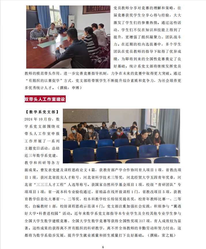 【数学系党支部】2024年10月份,数学系党支部围绕双带头人工作室申报工作开展了一系列主题党日活动,总结近三年数学系党建、教学和科研等各方面成果。曾发表党建及课程思政论文4篇,获教育部产学合作协同育人项目1项,省教改项目1项,获河北省拔尖人才称号,河北省科学技术三等奖,太阳成集团122ccvip五四青年奖章,河北省“三三三人才工程”人选等称号。获国家自然科学基金项目1项,校级“青研团队”专项项目1项;省一流本科专业验收通过,省精品在线开放课程1门,省教改项目5项,获公司产品信息化大赛省一、二等奖,校本科教学董事长特别奖提名奖,校青年教师比赛一、二等奖,自编教材1部,校级课程思政示范课6门。党支部注重加强社会实践,积极参与“冀遇好大学•科普进校园”活动。近年来数学系党支部指导本专业员工及全校其他专业员工参与全国老员工数学建模竞赛、全国老员工数学竞赛等获得全国性奖项317项,育人成效较为显著。这些成果的获得离不开有组织的科研教学,离不开全体教师的辛勤劳动和努力付出,这都将为数学系稳步发展、提升员工就业质量和招生质量打下良好基础。(撰稿:常之魁)