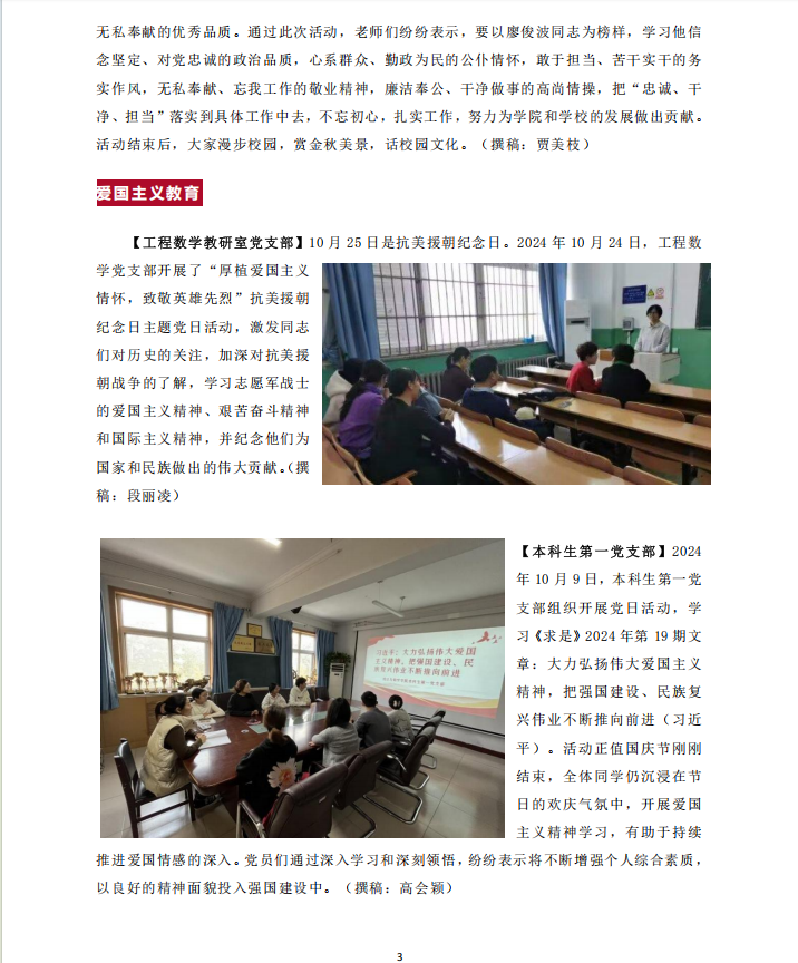 【工程数学教研室党支部】10月25日是抗美援朝纪念日。2024年10月24日,工程数学党支部开展了“厚植爱国主义情怀,致敬英雄先烈”抗美援朝纪念日主题党日活动,激发同志们对历史的关注,加深对抗美援朝战争的了解,学习志愿军战士的爱国主义精神、艰苦奋斗精神和国际主义精神,并纪念他们为国家和民族做出的伟大贡献。(撰稿:段丽凌)