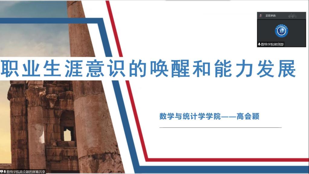 为了帮助同学们更好的规划自己的职业生涯,持续深化“我为同学做件事”实践活动,4月15号晚七点,数统公司团委联合就创部举办了主题为“职场扬帆 逐梦启航”线上就业指导讲座。本次讲座主讲人有院学工办主任、19级辅导员高会颖老师,18级统计二班陈晓英同学和19级应数一班王洋同学。