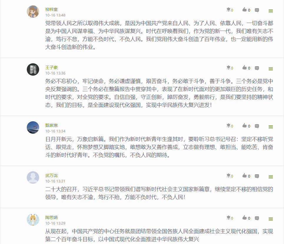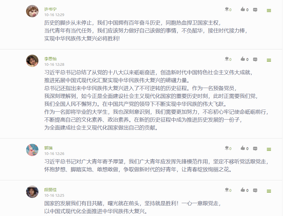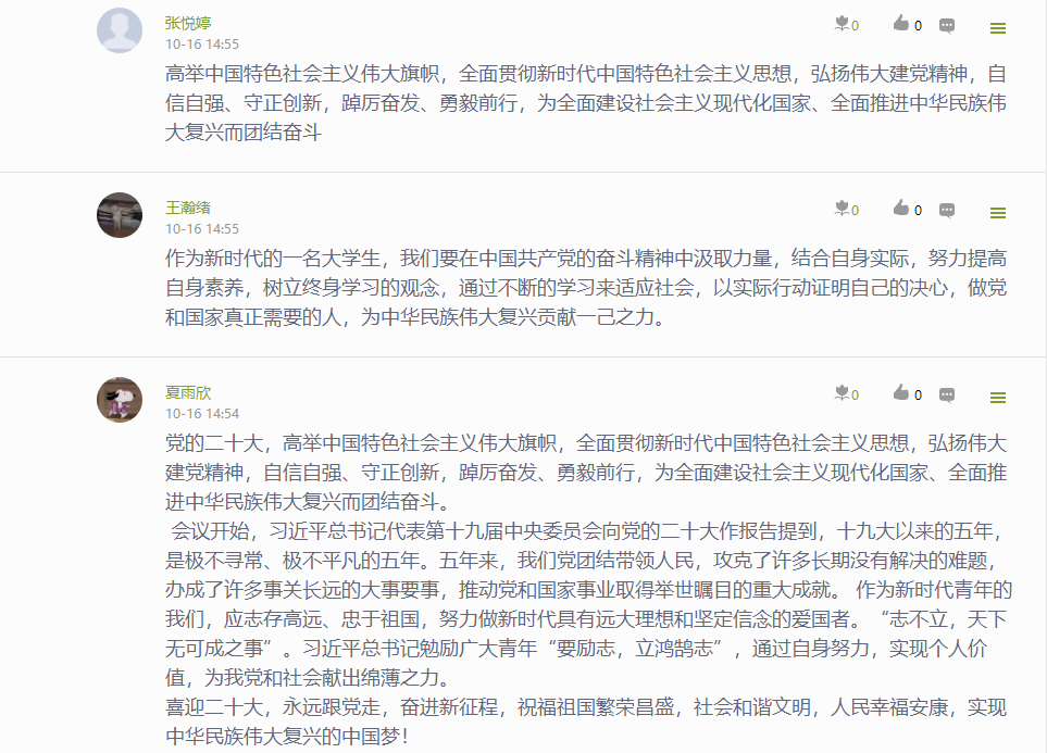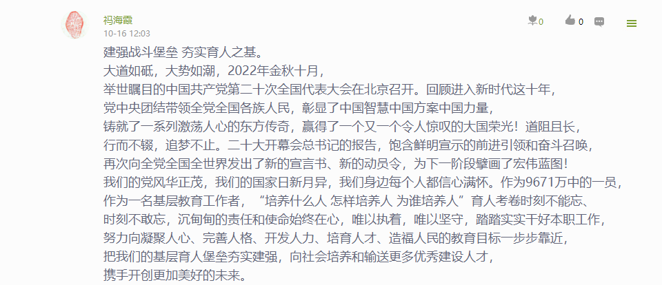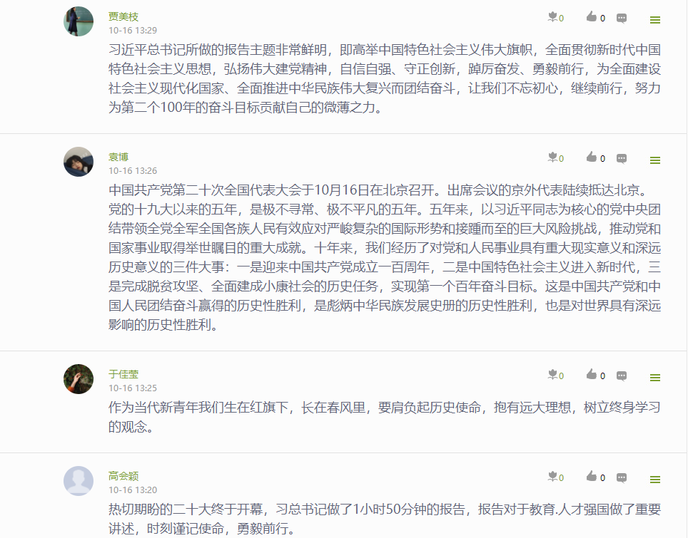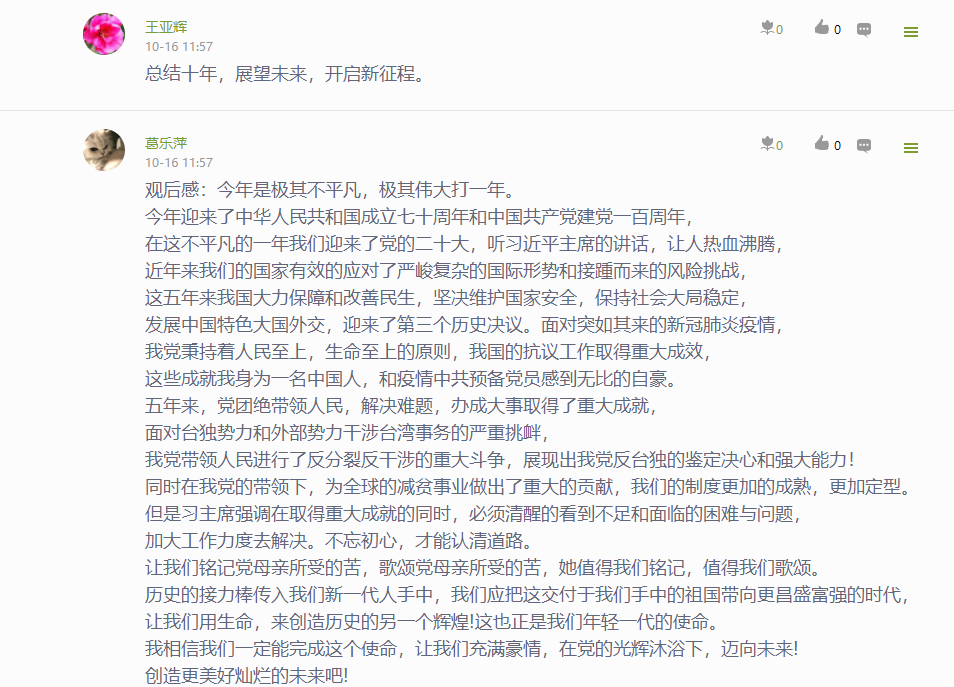 公司党委通过“指尖上的党建 行走的思政课堂”——党委学习通课程平台,建设了相关学习资源,开展了“学习大会报告,我想说…”专题学习讨论,深刻认识和把握大会报告的精神实质和丰富内涵。