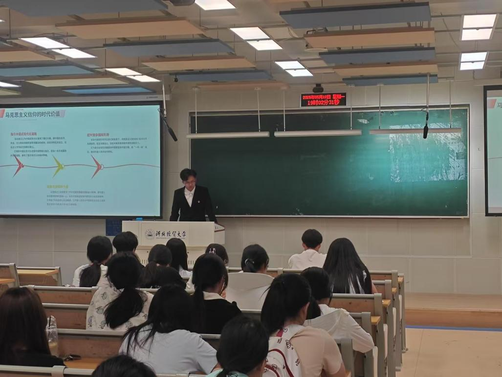 在首堂课程中,团委实践竞赛部干事庞炳章以《坚定马克思主义信仰,勇做中国式现代化新征程先锋》为题,从马克思主义唯物史观和人民至上的价值追求切入,对比西方现代化路径,深刻阐释中国式现代化的核心特征。课程结合脱贫攻坚、抗疫斗争等实践案例,展现马克思主义信仰在凝聚民族力量中的时代价值,号召青年以科研创新、基层服务等行动践行信仰,为中国式现代化建设贡献青春力量。