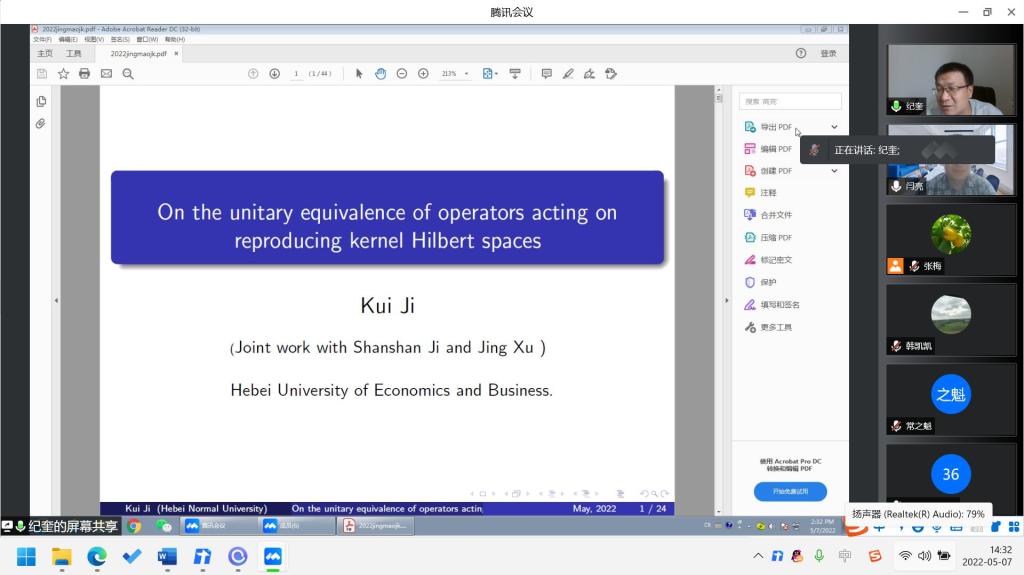 5月7日下午,数学与统计学公司邀请河北师范大学博士生导师纪奎教授在线作题为《On the unitary equivalence of operators acting on reproducing kernel Hilbert spaces》的学术报告。报告由数学与统计学公司副经理闫亮主持,公司多名师生参加。