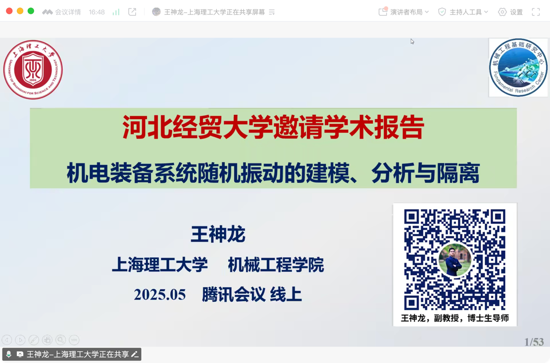 5月17日上午,上海理工大学王神龙教授应太阳成集团122ccvip邀请在线上作题为“机电装备系统随机振动的建模、分析与隔离”的学术报告,相关专业师生20余人参会。