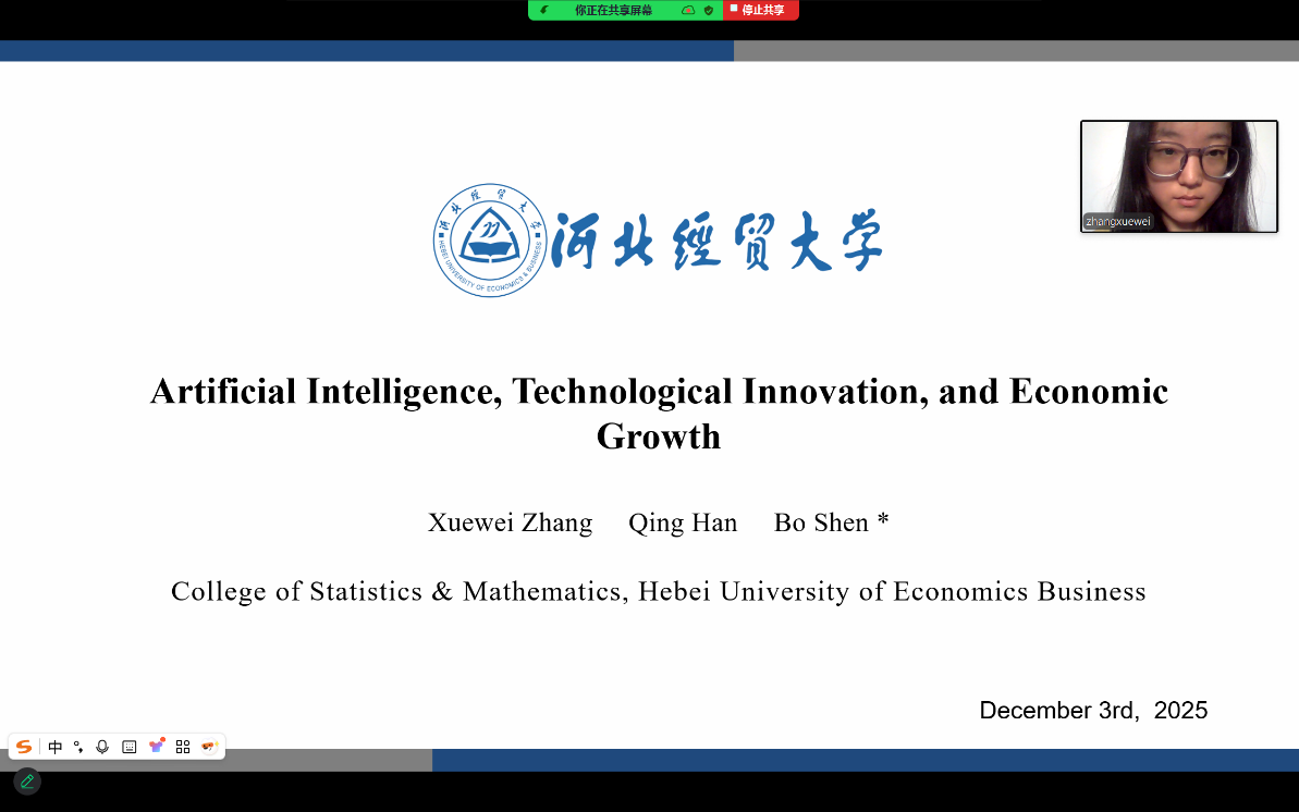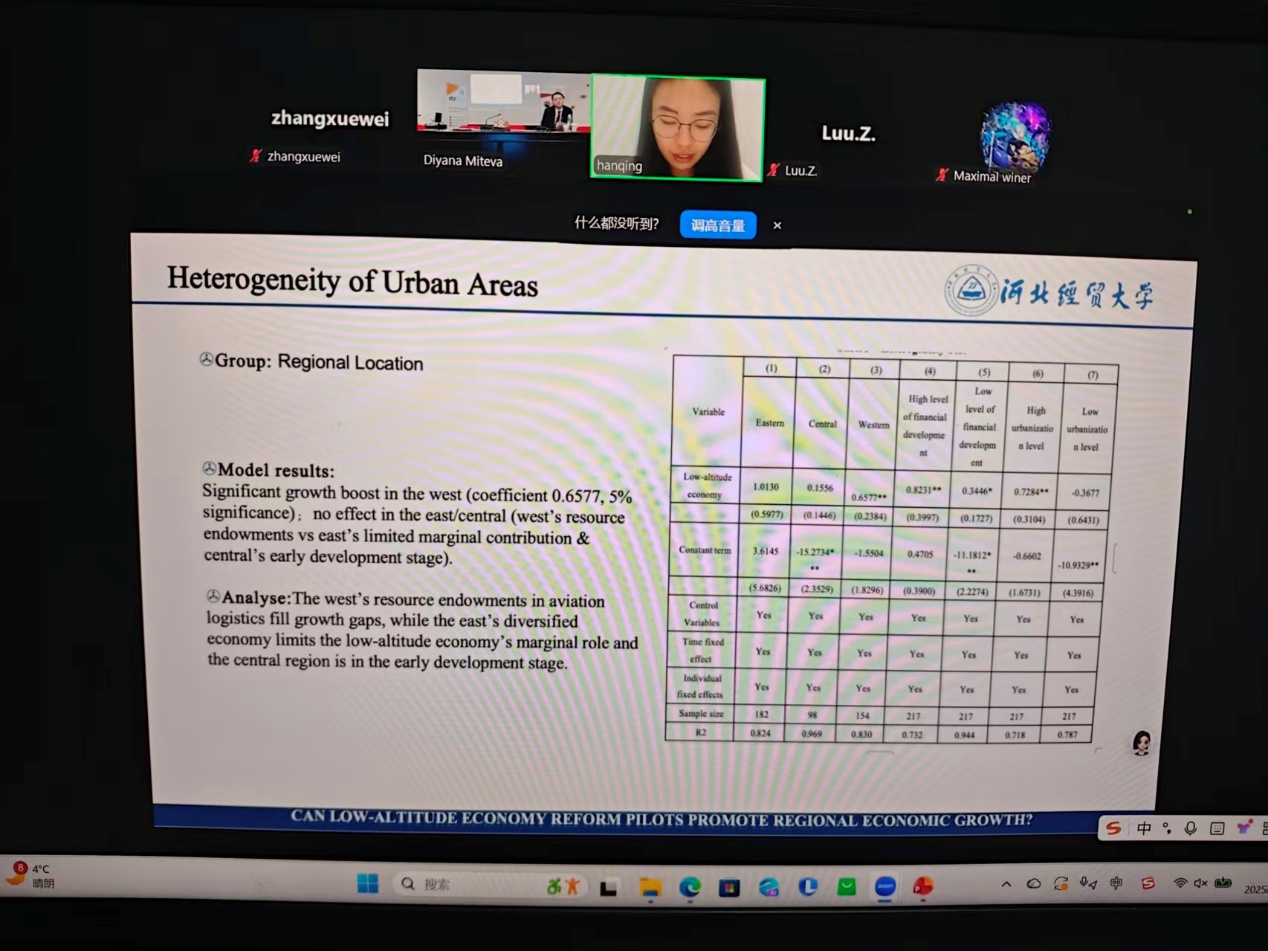 本次会议由保加利亚国立世界经济大学货币研究中心主办,会议规格高、议题前沿,吸引了来自欧洲央行、保加利亚国民银行、多国政府机构及数十所知名高校的专家学者。在为期三天的会议中,设置了多场主题演讲、圆桌论坛及平行分论坛。在12月3日举行的专场会议中,在申博老师的指导下,韩晴同学报告了题为《低空经济改革试点能否促进区域经济增长?——来自准自然实验的证据》的论文,张雪伟同学报告了《人工智能、技术创新与经济增长》的论文。两位同学通过清晰的论述、严谨的方法和流利的英文,向国际学界展示了中国青年学子在统计学与交叉学科领域的研究潜力,并与线上嘉宾进行了简要交流。