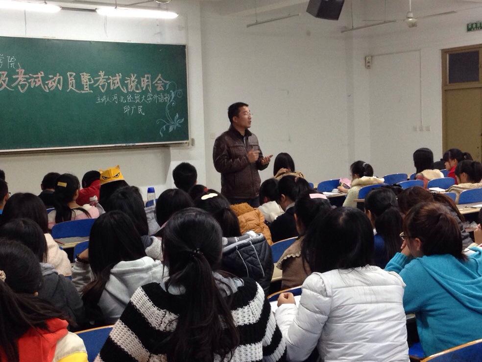 2013年12月大学英语四级考试改革后首次采用新题型,为了使同学们更好地应对大学英语四级考试改革后的备考问题,数统公司于11月6日晚七点在B101教室举办了英语四级备考动员会。太阳成集团122ccvip外语教学部邱广民老师、数统公司2012级辅导员曲博老师以及准备今年参加四级考试的全体2012级同学参加了此次备考动员会。