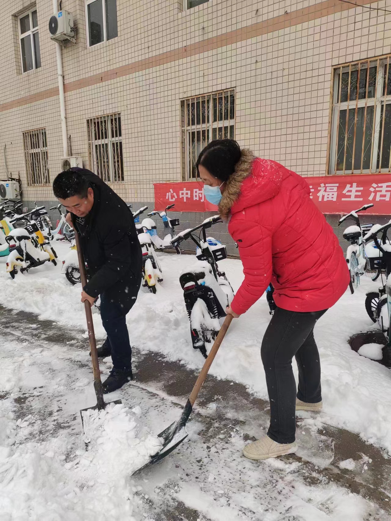 大雪之后的天气十分寒冷,却丝毫没有挡住老师和员工们劳动的热情,师生们积极主动,不畏严寒,纷纷拿着铁锹、铲子、扫帚等清雪工具积极投入清雪工作中去:扫积雪、铲冰层、清杂物、除路障,大家相互配合、齐心协力,你铲我扫,呈现出一派热火朝天的景象。