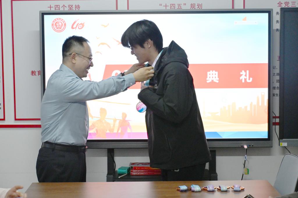 在热烈的掌声中,祃海霞、闫亮为排球队员逐一颁发并佩戴奖牌,表彰他们的拼搏与付出。