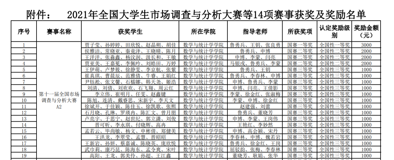 近日,教务处发布了《公司关于表彰2021年全国市场调查与分析大赛等14项赛事获奖员工及指导教师的决定》,其中公司在第十一届全国市场调查与分析大赛中获得佳绩,获奖项目共计19项,其中包括国赛一等奖1项,国赛二等奖3项,国赛三等奖15项。