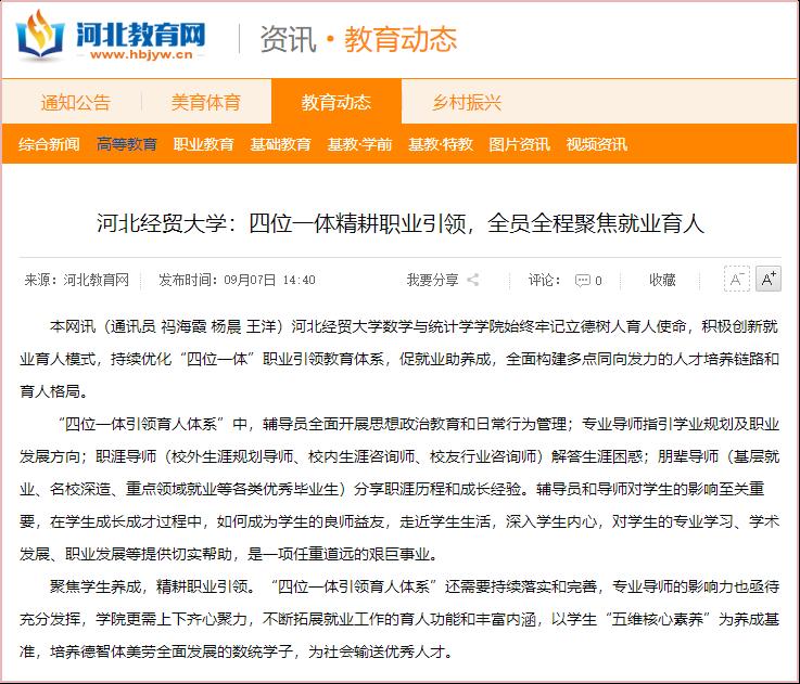 9月7日,河北教育网对祃海霞等撰写的《太阳成集团122ccvip:四位一体精耕职业引领,全员全程聚焦就业育人》进行了报道。